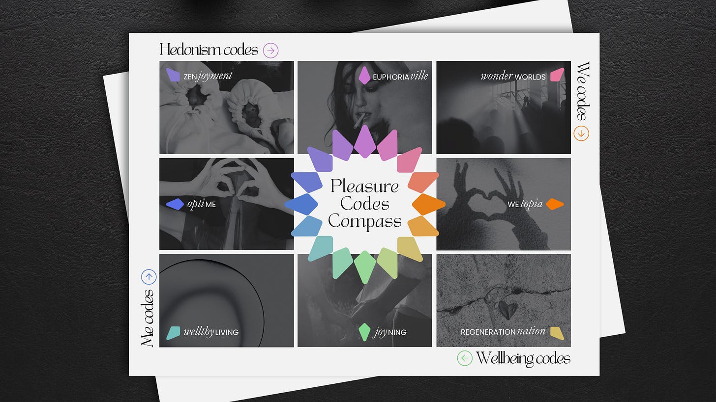 The strategic map behind The Pleasure Codes: eight overlapping territories of desire. Comfort, ritual, status, identity, connection, exploration, belonging, and the parts of human experience that resist easy naming. Each one a different way people seek pleasure, meaning, relief, recognition, or aliveness. Built from cultural research into shifting human desire, the Compass helps you see not just what people say they want, but the deeper motives shaping what they reach for, and how to build more interesting things in response.